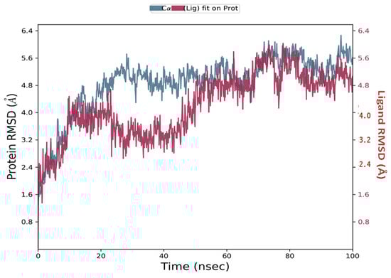Simulations of molecular dynamics revealed that the macromolecular complexes of ligands MMZ-45 against adenosine A1 receptor (ADORA1) were found to be most stable throughout the simulation time, concluding that the ligand MMZ-45 was supposed to be a potent anticancer agent and its therapeutic effect is executed via targeting ADORA1 enzyme. The target protein ADORA1 has 288 residues distributed in a macromolecular chain consisting of 2276 heavy atoms out of a total of 4703 atoms. The macromolecular target has only 58.7% beta strands constituting the secondary structure of the protein that remains conserved throughout the simulation process. Ligand MMZ-45 possesses 31 heavy atoms out of a total of 56 atoms. Dynamic simulation of the MMZ-45 macromolecular complex against the ADORA1 target clearly showed that the root-mean-square deviation (RMSD) for the fluctuation of the protein backbone was between 1.8 and 5.8 Å, which is well within the acceptable range. The macromolecular backbone required two conformational changes within the initial 20 ns to achieve the most stabilized conformation, which was maintained throughout the remaining simulation. Similarly, to achieve a stabilized conformation, the ligand MMZ-45 showed some initial fluctuations until 15 ns and then maintained the same throughout the simulation with the RMSD ranging between 4.0 and 5.6 Å. Observed RMSD for the macromolecular complex of MMZ-45 with the ADORA1 receptor is depicted in Figure 10.