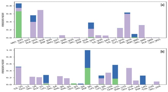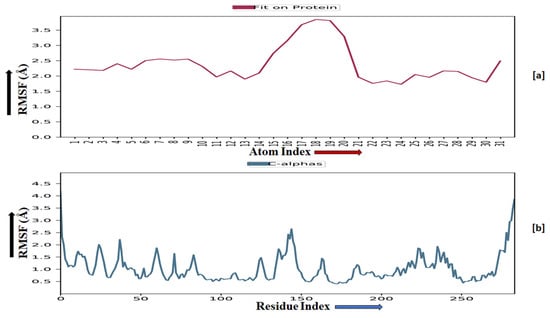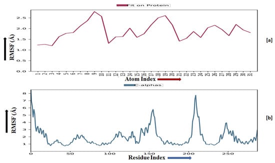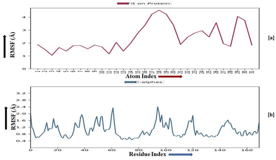 Root-mean-square fluctuation (RMSF) observed for the macromolecular complex of MMZ-45 (a) and the macromolecular backbone of transcription intermediary factor 1-alpha (TRIM24) protein (b) observed during 100 ns MD simulation.
