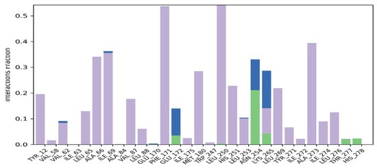 Ligand-receptor contacts for MMZ-45 and adenosine A1 (ADORA1) receptor observed during MD simulation of 100 ns. Purple—hydrophobic interaction; green—hydrogen bonds; blue—water bridges.