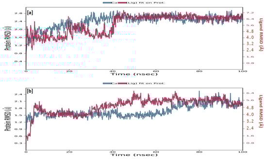 Root-mean-square deviation (RMSD) observed for the macromolecular complex consisting of MMZ-45 complexed within the macromolecular backbone of transcription intermediary factor 1-alpha (TRIM24) (a) and cyclin-dependent kinase 2 (CDK2) (b) observed during 100 ns MD simulation.