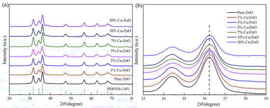 The full XRD spectrum and the local amplification spectrum of Cu-ZnO with different proportions at a diffraction angle of 20~80° are displayed in Figure 1a and Figure 1b, respectively. The peaks corresponding to 31.7°, 34.4°, 36.2°, 47.5°, 56.6°, 64.8°, and 66.3° are the characteristic diffraction peaks of hexagonal wurtzite ZnO, reflecting the crystal planes (100), (002), (101), and (102) [28,29]. The calculated crystallite sizes from the XRD results were 8.23 nm, 8.11 nm, 8.56 nm, 8.93 nm, 9.13 nm, 9.2 nm, and 9.23 nm for the ZnO, 1% Cu-ZnO, 3% Cu-ZnO, 5% Cu-ZnO, 7% Cu-ZnO, 10% Cu-ZnO, and 20% Cu-ZnO, respectively. The positions of the main peaks were not seen to change significantly with the increase in the Cu-doping amount (Figure 1a); no impurity peaks can be seen in the detection range of the XRD method. We speculate that the Cu may exist in the form of ions. Figure 1b shows that the spectrum after the position of the main peak is locally enlarged. We can see that the main peak tends to shift to the right and that the height of the peak decreases with the increase in the doping amount, which proves that the Cu was doped into the ZnO [30,31], leading us to tentatively speculate that the Cu was doped into the ZnO in the form of Cu ions. We tested the Cu content in the samples, which are shown in Table 1. The wt.% Cu content in the samples was 0.74%, 2.07%, 3.23%, 4.33%, 6.45%, and 11.62% for the 1% Cu-ZnO, 3% Cu-ZnO, 5% Cu-ZnO, 7% Cu-ZnO, 10% Cu-ZnO, and 20% Cu-ZnO, respectively.