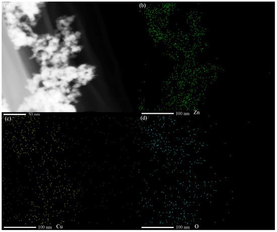 The TEM results for the Cu-ZnO nanocomposites are shown in Figure 2a. No Cu single particles can be found on the surface of the ZnO nanoparticles. The particle size ranges from 3.7 to 16.8 nm, which counted from 200 nanoparticles of the TEM images. In Figure 2b, the lattice distance of the exposed crystal plane is measured as 0.28 nm and 0.26 nm, corresponding, respectively, to the (100) crystal plane and the (002) crystal plane of the card of the characteristic diffraction peak of ZnO (JCPDS no. 36-1451). No lattice stripe of Cu is found. Observing the HRTEM of Cu-ZnO, it can also be seen that only ZnO particles appear in the material, and there is no single substance of Cu, which is consistent with the observation results from the XRD spectrum analysis. Scanning TEM, as shown in Figure 3, was used to study the microstructure and element distribution of the synthetic materials. It can be seen from the figure that the elements Cu, O, and Zn are evenly dispersed in the synthetic material.