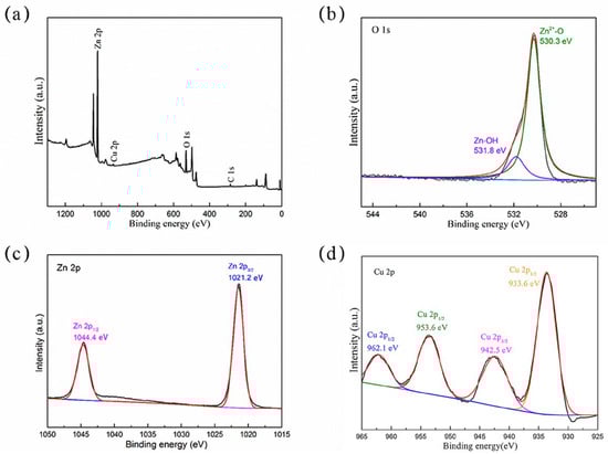 The XPS spectrum and fitting analysis results are shown in Figure 4. The full XPS spectrum in Figure 4a shows that carbon (C 1s), zinc (Zn 2p), copper (Cu 2p), and oxygen (O1s) exist in the composite. The XPS spectrum of O1s was amplified and analyzed, as shown in Figure 4b. The peaks of 530.2 eV and 531.8 eV were fitted and identified as an oxygen lattice in the Zn-O [32] and hydroxyl (O-H) [33] adsorbed on the material surface, respectively. The peaks of Zn 2p were fitted as 1021.2 eV and 1044.4 eV, respectively. In Figure 4c, they correspond to Zn 2p3/2 and Zn 2p1/2, respectively, indicating that the Zn element in the prepared composite exists as Zn2+, which proves that ZnO is indeed present [34], which is consistent with the previous results of XRD and TEM analysis. Furthermore, 934.9 eV and 954.7 eV correspond to the fitting peaks of Cu, representing Cu2+ 2p3/2 and Cu2+ 2p1/2, respectively. The two satellite peaks can be observed in Figure 4d, which proves that the synthesized composite contains Cu2+ [35]; this is consistent with our previous speculation on the existing form of Cu in XRD and TEM. Thus, Cu was doped in ZnO in the form of ions.