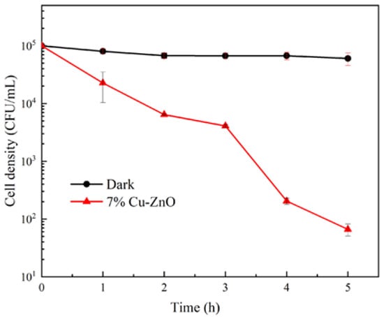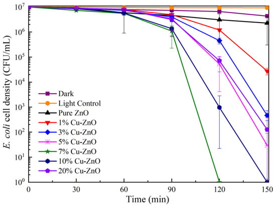 The bactericidal efficiency of Cu-ZnO with different doping ratios under visible light conditions is shown in Figure 6. The survival rate of E. coli was reduced to 92.67% after 150 min of visible light irradiation and without any additional materials. The decrease in the number of bacteria was greater than under dark conditions, indicating that this decline was caused by light damage [36]. Following the addition of pure ZnO, the survival rate of E. coli was reduced to about 87.82% after 150 min of visible light irradiation, proving that ZnO offers photocatalytic performance [37]. The photocatalytic disinfection performance shows clear improvement after doping with Cu ions. The 7% Cu-ZnO material presents the best sterilization performance, reducing the number of bacteria by seven orders of magnitude after 120 min of 30 mW/cm2 light intensity. The 10% Cu-ZnO material reduced the number of bacteria by seven orders of magnitude after 150 min, while the 3%, 5%, and 20% Cu-ZnO all reduced E. coli by about five orders of magnitude. In all of the synthesized samples, 7% Cu-ZnO exhibited the best photocatalytic performance. Thus, we tested this as one of the most important samples of TEM, XPS, and EIS.