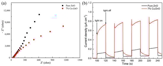 The electron impedance spectrum (EIS) shown in Figure 7a reflects the electron–hole recombination efficiency of the materials. The size of the radius is used to reflect the recombination rate of electrons and holes in the high-frequency region, whereby the larger the radius, the higher the electron–hole recombination rate. The electron–hole recombination rate of 7% Cu-ZnO is significantly lower than that of pure ZnO. The number of photoelectrons produced by the nanomaterials under light and dark conditions is shown by the transient photocurrent response spectrum. Figure 7b shows that under light conditions, the photocurrent density of the 7% Cu-ZnO composite is stable at about 0.8 μA cm−2, which is much higher than the photocurrent density of pure ZnO. Under dark conditions, the photocurrent density of 7% Cu-ZnO tends to be similar to that of pure ZnO, which conclusively shows that 7% Cu-ZnO produces photoelectrons under light conditions and that its efficiency is much higher than that of pure ZnO. Thus, the high photocurrent density of 7% Cu-ZnO could be due to the high separation efficiency of the electron holes.