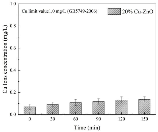 The precipitation degree of Cu ions is an important index to evaluate the safety of Cu-ZnO for use in water source treatment [40]. Figure 10 shows the release of Cu ions into water [41], taking 20% Cu-ZnO oxide as an example (tested using ICP-MS). The results show that the solubility of Cu ions was 0.07 mg/L before visible light irradiation, which may be due to the dissolution of a small number of copper clusters during ultrasonic dispersion. These dissolved Cu ions may have had an impact on the number of E. coli in the sterilization experiment, which supports our previous conclusion that the material also has a bactericidal effect under dark conditions due to the Cu ions. With the increase in illumination time, the solubility of the Cu ions in the composite gradually increased, reaching 0.13 mg/L at 150 min. The hygienic standard for drinking water [42] (GB5749-2006) issued by the UK Ministry of Health states that the detection limit for Cu ion concentrations in drinking water is 1.0 mg/L [43]; the maximum Cu ion solubility of 20% Cu-ZnO nanoparticles in this experiment was significantly less than 1.0 mg/L. Therefore, the concentration of Cu ions dissolved in water with the Cu-ZnO nanoparticles synthesized in this experiment was far below the safety threshold, and the potential for impact on the human body and the environment is therefore negligible.