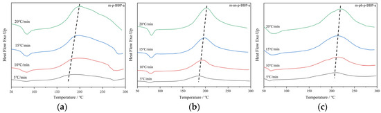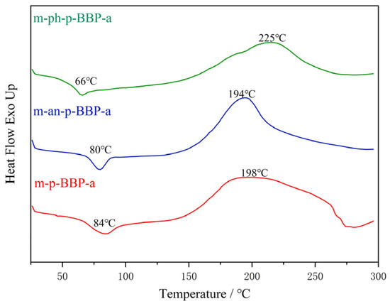 The m-p-BBP-a, m-an-p-BBP-a, and m-ph-p-BBP-a were ground into powder, which was dissolved in tetrahydrofuran with 4 wt% of 4,4′-Bis(3-aminophenoxy)diphenyl sulfone, respectively. Ultrasonic in a numerical control ultrasonic cleaner, evenly mixing, drying, and grinding for later use. The curing was accomplished by undergoing a cure cycle of 110 °C for 2 h, 130 °C for 2 h, 150 °C for 2 h, 170 °C for 2 h, 190 °C for 2 h, 200 °C for 2 h, and 220 °C for 4 h.