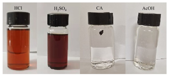 The mass of each piece was about 5 mg; DMF: water: 1 mol/L different acid solution = 5:2:4 (v/v/v), and the acids were HCl, H2SO4, anhydrous citric acid CA, and AcOH acetate. The acid concentrations of the mixed solutions were 0.364 mol/L, 0.727 mol/L, 1.091 mol/L, and 0.364 mol/L, which were degraded for 96 h at 55 °C.
