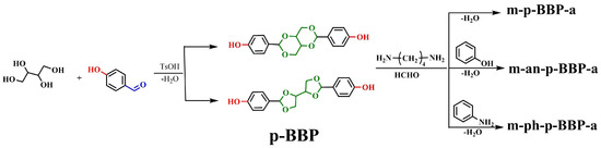 In this work, the acetal compound p-BBP was synthesized from the bio-based raw material erythritol. Erythritol widely exists in nature and is listed in the Generally Recognized as Safe list by the Food and Drug Administration, which is widely used for baked foods. The acetal structure is stable in alkaline and neutral conditions, and it will be hydrolyzed in an acidic solution. Then, with the acetal compound and butanediamine and paraformaldehyde as raw materials, benzoxazine-based resins with different structures of erythritol main chain (m-p-BBP-a, m-an-p-BBP-a, and m-ph-p-BBP-a) (
