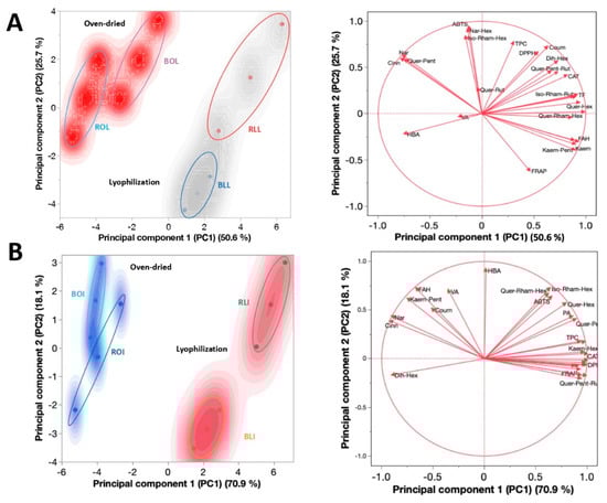 2.3. Principal Component Analysis (PCA) of Oven-Drying and Lyophilization Clustering