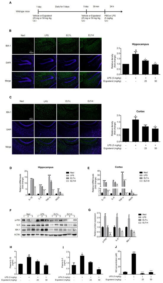 Ergosterol markedly decreased LPS-stimulated microglial activation and inflammation in ICR mice. (A) ICR mice were injected daily with Ergosterol (25 mg/kg, 50 mg/kg, i.p.) or vehicle (PBS, i.p.) for 5 days, followed by LPS (5 mg/kg, i.p.) or PBS injected for 24 h. The mice were then perfused and fixed. (B,C) An anti-IBA-1 antibody was used for immunohistochemistry. Quantification of IBA-1 fluorescence strength in the cerebral cortex or hippocampus (Nacl, n = 8 mice; LPS, n = 8 mice; Ergosterol 25 mg/kg + LPS is marked as ELT-L, n = 8 mice; Ergosterol 50 mg/kg + LPS is marked as ELT-H, n = 8 mice). (D,E) The mRNA levels of the IL-1β, IL-6, TNF-α, and INOS inflammatory factors in the cortex and hippocampus of the mice were measured with qRT-PCR. (F) The p-P65, IL-6, and IBA-1 protein levels were determined by Western blot. Actin was used as a housekeeping control (Nacl, n = 3 mice; LPS, n = 3 mice; ELT-L, n = 3 mice; ELT-H, n = 3 mice). (G) The relative expression level of protein to actin was calculated by densitometry. (H,I) The protein levels of IL-1β and IL-6 in plasma were detected by ELISA. (J) The expression levels of NO in plasma were detected with a Griess assay. Statistical significance was analyzed using one-way ANOVA and t test. # Significantly different from the control; * significantly different from the LPS-treated group. Significance: # p < 0.05, ## p < 0.01, ### p < 0.001, #### p < 0.0001, * p < 0.05, ** p < 0.01, *** p < 0.001, and **** p < 0.0001.