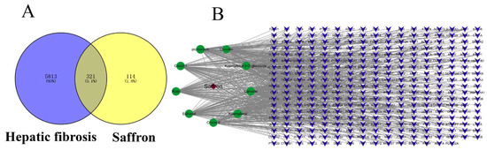 Network construction. (A) Venn diagram of saffron and liver fibrosis candidate targets. (B) Herbal component target network of the anti-fibrosis effect of saffron. The red node represents herbal medicine, and the blue nodes represent 321 putative targets of saffron in the treatment of liver fibrosis. The green nodes represent 9 active components in saffron.