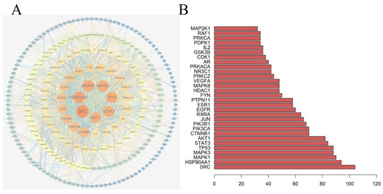 PPIs network of interaction targets. (A) PPIs network; (B) Core targets histogram.