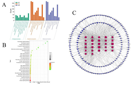 Functional analysis. (A) GO enrichment analysis of putative targets. (B) KEGG pathway enrichment analysis of hypothetical targets. (C) Target-signaling pathway network. The red node represents the main signal pathway, and the blue node represents the putative target of saffron in the treatment of liver fibrosis.