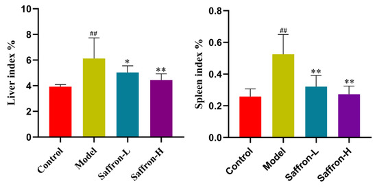 In general, body weight, liver, and spleen weights were recorded, and liver and spleen indices were calculated. Compared with the control group, liver weight and liver index, spleen weight, and spleen index were significantly increased in the model group. In contrast, compared with the model group, the saffron treatment group could effectively reduce spleen index (−38.6% and −48.2%) (p < 0.01) and liver index (−17.8% and −27.6%) (p < 0.05 and p < 0.01) (Figure 6).