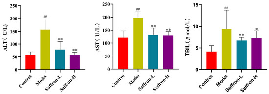 In order to investigate the changes in liver function after saffron treatment, the levels of serum ALT, AST, and TBIL were measured. Compared with the control group, the levels of serum ALT, AST, and TBIL in the model group increased significantly, indicating that CCl4 treatment leads to serious liver injury. Importantly, saffron treatment significantly reduced serum AST (−33.1% and −34.1%) (p < 0.01), ALT (−49.9% and −63.4%) (p < 0.001), and TBIL (−19.7% and −22.1%) (p < 0.05) levels in a dose-dependent manner, indicating that saffron significantly reduces CCl4-induced hepatotoxicity (Figure 7).