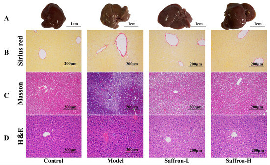 The livers of mice in each group were visually observed and compared (Figure 8A). The appearance of the liver in the control group was smooth, reddish brown, soft, and elastic. The appearance of the liver in the model group was brownish yellow, hard, and blunt, the liver edge was thick, and many small gray-white nodules were distributed on the surface. In addition, some surfaces had slight orange peel changes. Compared with the model group, after saffron treatment, the above pathological characteristics were significantly reduced.