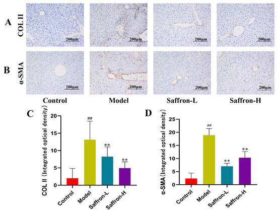 During liver fibrosis, activated hematopoietic stem cells lead to the proliferation and overexpression of α-SMA, and Col II is an important initiator of liver fibrosis. The results show that α-SMA and Col II were minimally expressed in normal liver tissues. Compared with the control group, the positive expression area of α-SMA and Col II increased significantly (p < 0.01), and the brownish-yellow area became darker, mainly distributed in the portal vein area and the fiber area, and the degree of hepatic fibrosis deepened in the model group. Compared with the model group, the positive expression area of α-SMA and Col II in the liver tissue of the saffron group were significantly reduced (p < 0.01), and the brown-yellow area was reduced in area and lightened in color (Figure 9). Taken together, these findings suggest that saffron extract can inhibit the accumulation of collagen and alleviate and reverse the production of liver fibrosis.