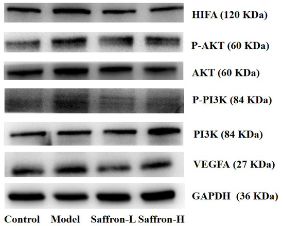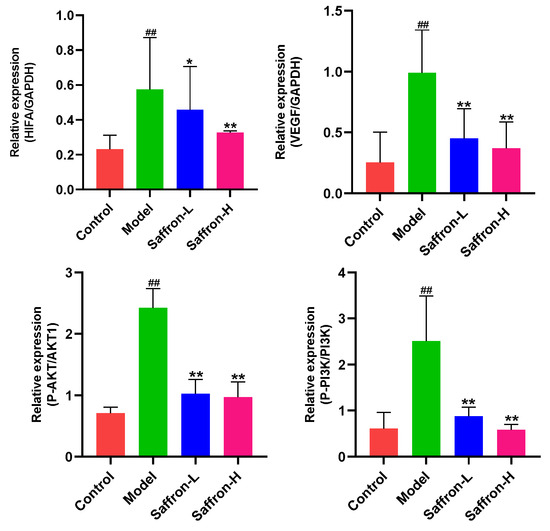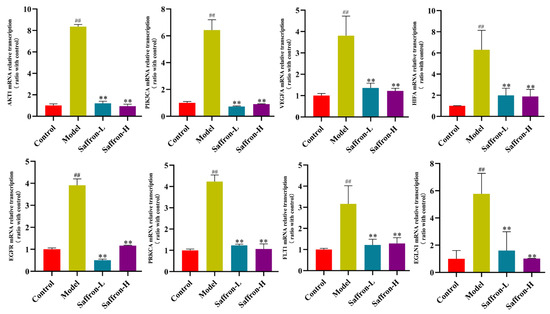 The mRNA and protein expression levels of the genes involved in the AKT/HIF-1/VEGF signaling pathway obtained from the network pharmacological screen were determined by RT-PCR and Western blotting. RT-PCR was used to detect the mRNA expression levels of AKT/HIF-1α/VEGF signaling pathway-related genes (Figure 10). The results show that the mRNA expression of AKT1, PIK3CA, VEGFA, HIFA, EGFR, PRKCA, FLT1, and EGLN1 in the liver AKT/HIF-1/VEGF signaling pathway in the model group was significantly lower than that in the control group (p < 0.001). The mRNA levels of the saffron-treated group were significantly lower than those of the model group.