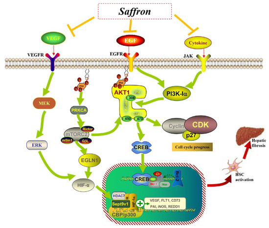 Liver fibrosis is a complex disease, and current treatment options for liver fibrosis remain limited. The research results prove that saffron has a therapeutic effect on liver fibrosis, and its mechanism of action is related to the regulation of the AKT/HIF-1α/VEGF signaling pathway. In the CCl4-induced liver fibrosis model, saffron inhibited the inflammatory infiltration in the process of liver fibrosis by regulating and inhibiting the inflammatory AKT/PI3K signaling pathway, while regulating HIF-1α/VEGF signaling pathway can improve the insufficient blood supply of hepatocytes, vascular diseases, and cell hypoxia caused by the destruction of liver tissue structure, as shown in Figure 12.