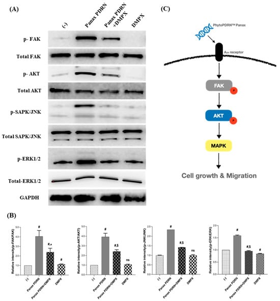 2.3. Panax PDRN Activates the A2A Receptor and Regulates Cell Proliferation through the FAK-AKT-Mitogen-Activated Protein Kinase (MAPK) Signaling Pathway