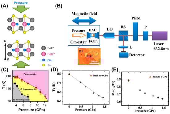 - Sun, Y.; Xiao, R.C.; Lin, G.T.; Zhang, R.R.; Ling, L.S.; Ma, Z.W.; Luo, X.; Lu, W.J.; Sun, Y.P.; Sheng, Z.G. Effects of hydrostatic pressure on spin-lattice coupling in two-dimensional ferromagnetic Cr2Ge2Te6. Appl. Phys. Lett. 2018, 112, 072409. [Google Scholar] [CrossRef]