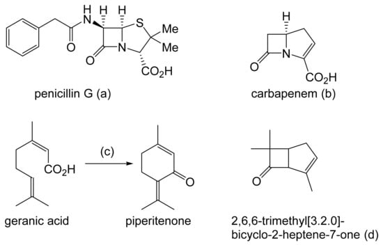 Prior to the early 1960s, there were no reports in the scientific literature in any context of compounds containing an oxy-functionalised bicyclo[3.2.0]carbocyclic ring system, and interest in such compounds was essentially esoteric. This differs sharply from the explosion of involvement and endeavour [], driven mainly by the pharmaceutical industry, that followed the discovery and subsequent characterisation of natural products such as penicillin G, originally from Penicillium notatum (Figure 1a []), and carbapenem from Serratia and Erwinia spp. (Figure 1b []), which proved to be heterocyclic fused-ring compounds containing a signature four-atom β-lactam ring structure. Contrastingly, it was only by pure serendipity that the first synthetic oxy-functionalised bicyclo[3.2.0]carbocyclic fused-ring compound was isolated and identified []. While attempting to replicate the earlier recorded synthesis of piperitenone by the self-condensation of geranic acid (Figure 1c), a research team working for the major pharmaceutical company Pfizer in the mid-1960s used a sample of the acid containing residual traces of silver oxide. Their use of the contaminated polyunsaturated fatty acid probably accounts for the detection in the resulting neutral fraction of not only the expected piperitenone, but an additional product that was then isolated and reported to be ‘2,6,6-trimethyl[3.2.0]bicyclo-2-heptene-7-one’ (Figure 1d: current nomenclature = 4,7,7-trimethylbicyclo[3.2.0]hept-3-en-6-one). The bicyclic ketone, the value of which Pfizer saw as a derivatised cyclobutanone, was assumed to be a racemic mixture.