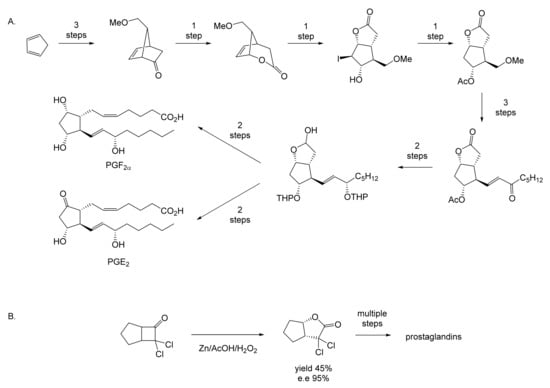 Key steps in the chemocatalytic synthesis of prostaglandins: (A) Corey et al. []; (B) Tomoskozi et al. [].