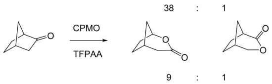 Outcome of the biooxygenation of norbornanone by a washed cell suspension of cyclopentanol-grown Pseudomonas NCIB 9872 compared to the equivalent chemical oxidation by trifluoroperacetic acid. Adapted with permission from []. 1989. Springer Nature.