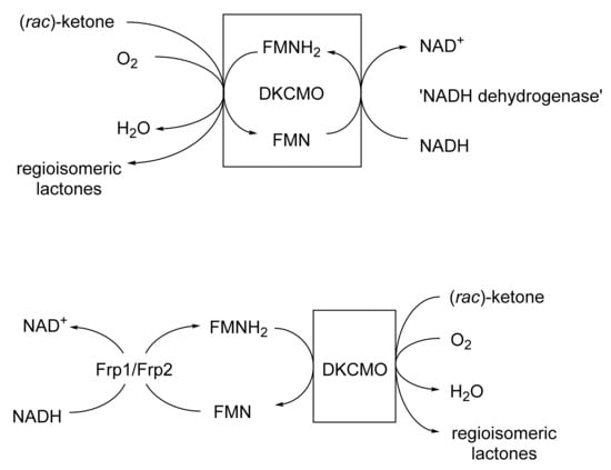 - Torres Pazmino, D.E.; Snajdrova, R.; Baas, B.-J.; Ghobrial, M.; Mihovilovic, M.D.; Fraaije, M.W. Self-sufficient Baeyer-Villiger monooxygenases: Effective coenzyme regeneration for biooxygenation by fusion engineering. Angew. Chem. Int. Ed. 2008, 47, 2275–2278. [Google Scholar] [CrossRef] [PubMed]