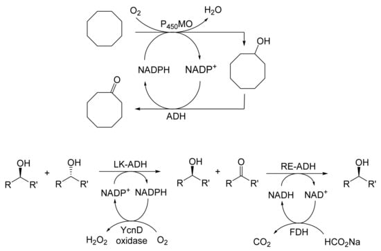 - Schrittwieser, J.H.; Sattler, J.; Resch, V.; Mutti, F.G.; Kroutil, W. Recent biocatalytic oxidation-reduction cascades. Curr. Opin. Chem. Biol. 2011, 15, 249–256. [Google Scholar] [CrossRef]