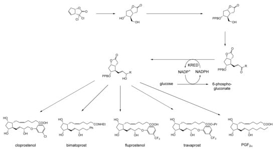 - Contente, M.L.; Zambelli, P.; Galafassi, S.; Tamborini, L.; Pinto, A.; Conti, P.; Molinari, F.; Romano, D. A new chemoenzymatic approach to the synthesis of latanoprost and bimatoprost. J. Mol. Catal. B Enzym. 2015, 114, 7–12. [Google Scholar] [CrossRef]