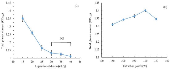 Effects of (A) extraction temperature, (B) extraction time, (C) liquid-to-solid ratio, and (D) extraction power on the TPC of C. aurantium leaf extract. Data are expressed as the means and standard deviations of three independent experiments. (NS = not significant p > 0.05).