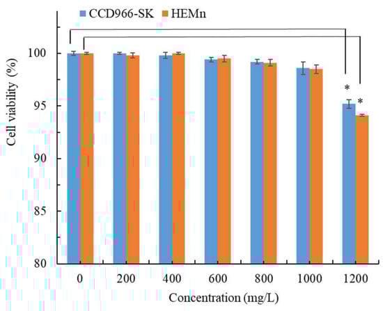 Cytotoxic effect of C. aurantium leaf extract obtained through ultrasonic-assisted extraction under optimal conditions in CCD-966SK and HEMn cells after 72 h treatment. Fresh medium was used as a control. Data are expressed as the means and standard deviations of three independent experiments. Significant difference was expressed by * p < 0.05.