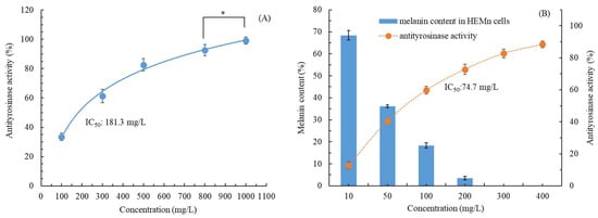 (A) In vitro antityrosinase activity and (B) antityrosinase activity and melanin content in HEMn cells after treatment with C. aurantium leaf extract obtained through ultrasonic-assisted extraction under optimal conditions. Data are expressed as the means and standard deviations of three independent experiments. Significant difference was expressed by * p < 0.05.