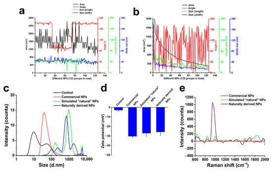 Comparison of the different types of 50–100 nm NPs. (a,b) Size parameters of the two types of NPs ((a): commercial NPs; (b): naturally derived NPs). (c) Size distribution of the three types of NPs (Control: ultra-pure water). (d) Zeta potential of the three types of NPs (Control: ultra-pure water). (e) Raman spectra of the three types of NPs.