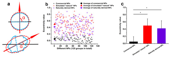 (a) Schematic of the assessment of NP shape (black line: axis of symmetry; blue line: the actual shape of the NPs; red line: ellipses converted by NPs). (b) The eccentricity of three different types of NPs (The abscissa represents the number of NPs; The hollow shapes represent the eccentricity of a single NP, while the solid shapes represent the average eccentricities of all NPs in each group). (c) The average eccentricities of commercial NPs, synthetic “natural” NPs, and naturally derived NPs. *: p < 0.05.