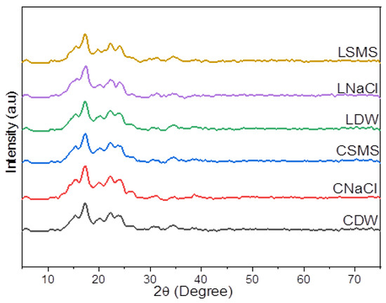 The XRD pattern of starches of Chanqua and Loffo starches. CDW, CNaCl, and CSMS = Distilled water-, Sodium Chloride- and Sodium metabisulfite-isolated Chanqua starch, whereas LDW, LNaCl, and LSMS = Distilled water-, Sodium Chloride- and Sodium metabisulfite-isolated Loffo starch.