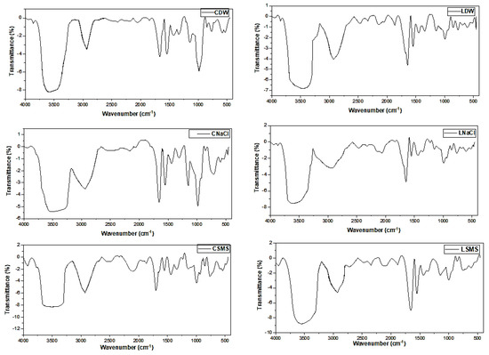 FTIR spectra of the EP starches. CDW, CNaCl, and CSMS = Distilled water-, Sodium Chloride-, and Sodium metabisulfite-isolated Chanqua starch, whereas LDW, LNaCl, and LSMS = Distilled water-, Sodium Chloride-, and Sodium metabisulfite-isolated Loffo starch.