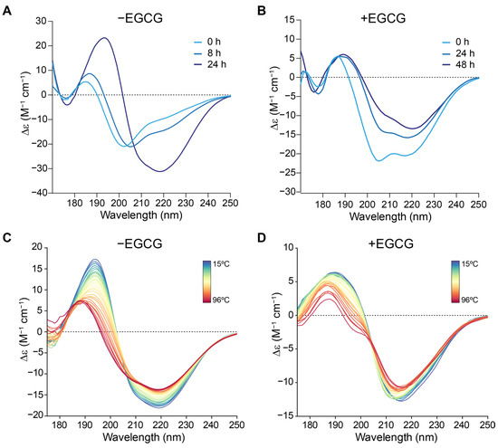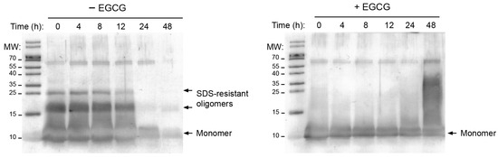 - Bieschke, J.; Russ, J.; Friedrich, R.P.; Ehrnhoefer, D.E.; Wobst, H.; Neugebauer, K.; Wanker, E.E. EGCG Remodels Mature α-Synuclein and Amyloid-β Fibrils and Reduces Cellular Toxicity. Proc. Natl. Acad. Sci. USA 2010, 107, 7710–7715. [Google Scholar] [CrossRef] [PubMed]