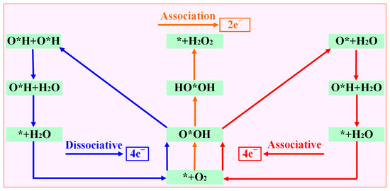 According to the different reduction products, the ORR can be divided into a 2e− pathway to produce H2O2 and a 4e− pathway in which the product is H2O. The 4e− pathway can be divided into a dissociative mechanism and association mechanism (Figure 4). Compared with the 2e− pathway, the 4e−- pathway has better energy conversion efficiency, so suitable ORR catalysts must have good 4e− selectivity. The intermediate O*OH (* + O2 + H+ + e− → O*OH) is obtained by one-step protonation of O2. O*OH can be reduced to H2O2 through the path O*OH + H+ + e− → * + H2O2 or O*OH + H+ + e− →O* + H2O to obtain O*; so, it is necessary to determine whether the catalyst is thermodynamically inclined to the 4e− pathway or the 2e− pathway. Therefore, this paper is determined by comparing the formation barrier of H2O2 and the barrier to obtain O* and H2O.