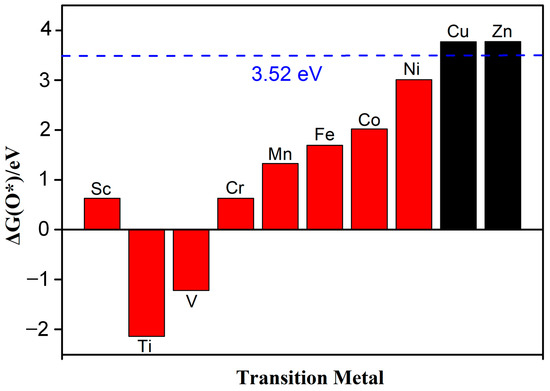 Guo et al. systematically studied the selectivity of ORRs and found that the Gibbs free energy (∆GO*) of O* for the 4e− pathway should be less than 3.52 eV (∆GH2O2 − ∆GH2O) [25]. On the contrary, the Gibbs free energy for the 2e− pathway should be greater than 3.52 eV. The Gibbs free energy of the reaction was determined using the computational hydrogen electrode model (CHE) proposed by Nørskov and co-workers [26], and the details are described in our previous reports [27]. This paper focuses on reactions under strongly acidic conditions (pH = 0). Figure 5 shows that except for Cu-N2O2Cx and Zn-N2O2Cx, the Gibbs free energy of ∆G*O for the other eight catalysts is all less than 3.52 eV, indicating that the ORR mechanism of Cu-N2O2Cx and Zn-N2O2Cx is the 2e− pathway (Figure S2), and the rest of the SACs are more inclined to the 4e− pathway. Next, we focus on exploring the 4e− pathway mechanism of the above eight catalysts.