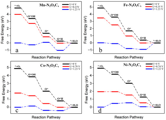 Free energy diagram of 4e− ORR on Mn-N2O2Cx (a), Fe-N2O2Cx (b), Co-N2O2Cx (c), and Ni-N2O2Cx (d) under different potentials. The black line, blue line, and red line represent U = 0 V, U = limiting potential, and U = 1.23 V, respectively.