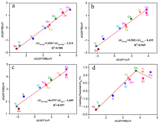 Figure 8a–c shows the Gibbs adsorption free energy relationships between different reaction intermediates (such as O*OH, O*H, O*) for the electrocatalytic O2 reduction by TM-N2O2Cx single-atom catalysts. The Gibbs adsorption free energy relative to H2O and H2 were calculated based on the following equations: ΔGO*H = GO*H + 0.5GH2 − G* − GH2O (6); ΔGO* = GO* + GH2 − G* − GH2O (7); ΔGO*OH = GO*OH + 1.5GH2 − G* − 2GH2O (8). G* is the free energy of TM-N2O2Cx, while GH2 and GH2O represent the gas phase free energy of H2 and H2O molecules, respectively. The results indicate that no matter the active metal atom, there is a universal scaling relation between O*OH, O*H, and O*. ΔGO*H can be represented by ΔGO*OH through the function ΔGO*H = 1.036ΔGO*OH − 3.214 eV (Figure 8a) or by ΔGO* through the function ΔGO*H = 0.502ΔGO* − 0.435 eV (Figure 8b). The coefficients of determination (R2) are 0.988 and 0.969, respectively, indicating a very strong linear relationship between ΔGO*H and ΔGO*OH or ΔGO*. In addition, Δ GO*OH can be created by Δ GO* through the function Δ GO*OH = 0.479 Δ GO* −2.689 eV (Figure 8c), and the same strong linear relationship exists between ΔGO*OH and ΔGO* (R2 = 0.957). These results are in agreement with previous studies [30,31]. Thus, the catalytic activity of TM-N2O2Cx single-atom catalysts for electrocatalytic O2 reduction can be described by the descriptors ΔGO*H, ΔGO*OH, or ΔGO*.