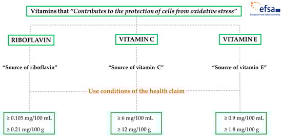 According to Regulation (EC) No 1924/2006; Regulation (EU) 432/2012, establishing a list of permitted health claims made on foods other than those referring to the reduction of disease risk and to children’s development and health; and Regulation (EU) No 1169/2011, on the provision of food information to consumers, those food products intended to use the above-mentioned health claim in their labeling, presentation, and/or advertisement must meet the specific requirement of being at least a “Source of” these vitamins. That is, significant contents of the Nutrient Reference Value (NRV) of riboflavin, vitamin C, and vitamin E. NRV of vitamins are included in Annex XIII of Regulation (EU) No 1169/2011. Depending on the type of food product, a significant content will mean 15% NRV (foods) or 7.5% NRV (beverages) supplied by 100 g or 100 mL of product, respectively [28,38,39]. Table 1 and Figure 1 summarize the conditions required to use this health claim.
