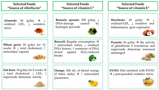 Lastly, clinical trials conducted in humans were selected among the studies with the highest levels of scientific evidence. English language, year of publication, and the keywords ‘vitamin’, ‘antioxidant’, ‘oxidative stress’, ‘dietary sources’, and ‘foods of plant origin’ were defined as the inclusion criteria as well. Both scientific studies that directly focused on other bioactive compounds, different from the ones selected in the present review, as well as trials performed in animals and/or in vitro studies were not considered (exclusion criteria). In addition, studies assessing the effect of supplementation with pharmaceutical forms (capsules, powder, etc.) were not selected.