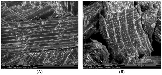 Morphological analysis via the scanning electron microscopy of native (Figure 1A) and chemically activated cedar sawdust (Figure 1B) shows significant changes in the topography of their surfaces. This could be explained by the beginning of cellulosic defibrillation because of the dissolution of extractives, hemicelluloses, and a large part of lignin, thus leading to a reduction in the lengths of the microfibrils and to an improvement in the porosity of these sawdusts (Figure 1).