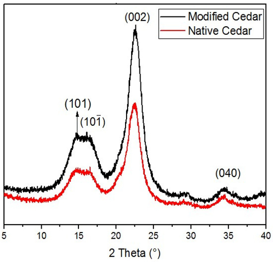 Diffractograms of native cedar sawdust and sawdust chemically modified with HNO3/NaOH.