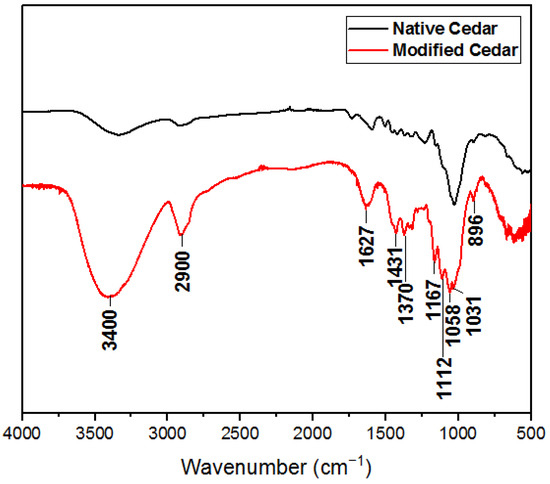From the absorption spectra, it can be seen that the chemical treatment of sawdust with nitric acid followed by sodium hydroxide leads to the disappearance of the absorption band characteristic of the valence vibration of C=O of carboxylic acids and/or xylan esters present in hemicelluloses and lignin (around 1725 cm−1), as well as the disappearance of the absorption band attributed to the C=C deformation of the aromatic rings of lignin and the vibration of the CH bonds of aromatic polysaccharides (around 1500 cm−1). There is also a decrease in the intensity of the absorption bands linked to the deformation of the C-H bonds of lignin and hemicelluloses due to the solubilization of most lignin and hemicelluloses (between 1230 and 1370 cm−1) [32]. On the other hand, the characteristic bands of cellulose (1167 cm−1; 1112 cm−1, and 1058 cm−1) become sharper (Figure 3).