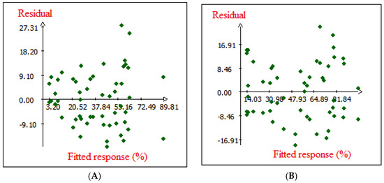 Figure 4 shows the plot of observed Cr (VI) removals on native and modified cedar versus those obtained from the model, which will later reveal the comparison between these two. The results obtained indicate a high dependence and correlation between the observed experimental and predicted data of the responses (Cr (VI) removal onto native and modified cedar sawdust) via the empirical quadratic model. Because the curve is quite straight, the fit of the predicted data in the quadratic model for Cr (VI) removal onto the experimentally observed data for native and modified Cedar is quite good. Furthermore, the examination of the obtained fitted quadratic model is important. If this later fails to reveal an adequate correlation, the model optimization methods will probably generate erroneous or unwanted predictions. In this matter, the residuals have an essential role in evaluating the suitability of the model. As shown in Figure 5, the residuals did not distribute regularly along the zero line; however, the distribution of data was observed between approximately ±9.10 in the case of native cedar and ±16.91 in the case of modified cedar. These results show that the observed experimental data agrees quite well with the data predicted by the empirical quadratic model [40].